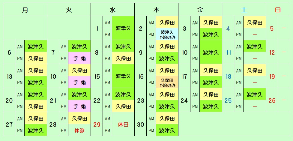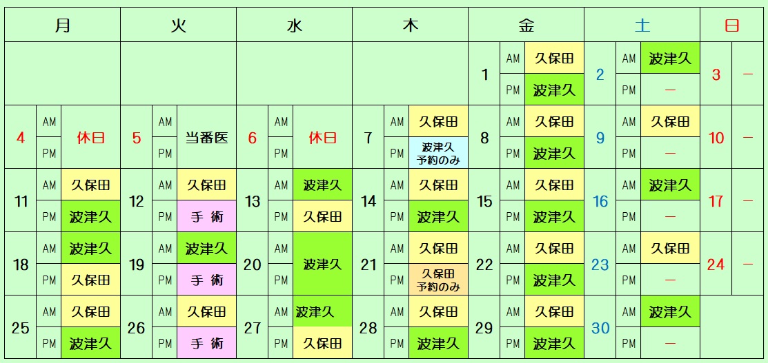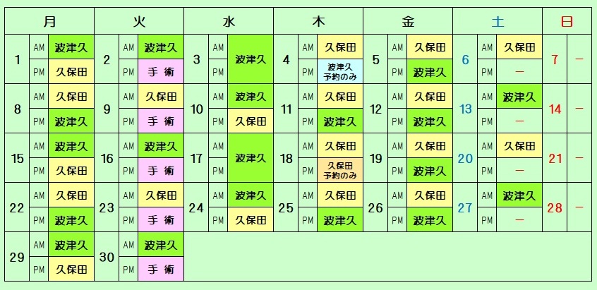 | 診療担当医師・休診日のお知らせ(2026.3.2更新) 学会等の都合により、担当医師が急に変更になることもあります 。 第1・3木曜日の午後は予約の患者さんのみになります。 4月の予定 ![]() 学会等の都合により、担当医師が急に変更になることもあります 。 第1・3木曜日の午後は予約の患者さんのみになります。 5月の予定 ![]() 学会等の都合により、担当医師が急に変更になることもあります 。 第1・3木曜日の午後は予約の患者さんのみになります。 6月の予定 ![]() |