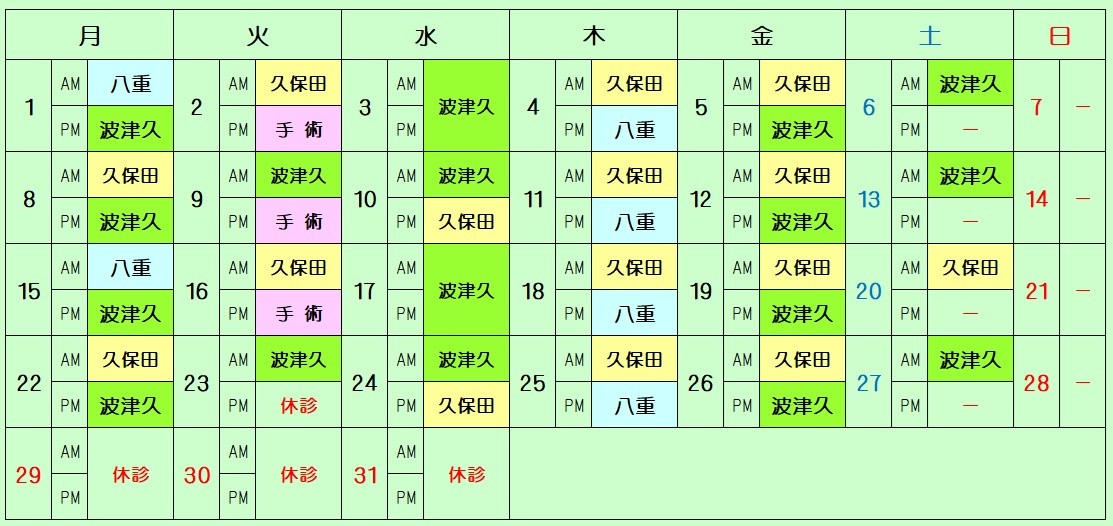 | 診療担当医師・休診日のお知らせ(2025.9.30更新) 10月の予定 ![]() 学会等の都合により、担当医師が急に変更になることもあります。 11月の予定 ![]() 学会等の都合により、担当医師が急に変更になることもあります。 12月の予定 ![]() 学会等の都合により、担当医師が急に変更になることもあります。 |