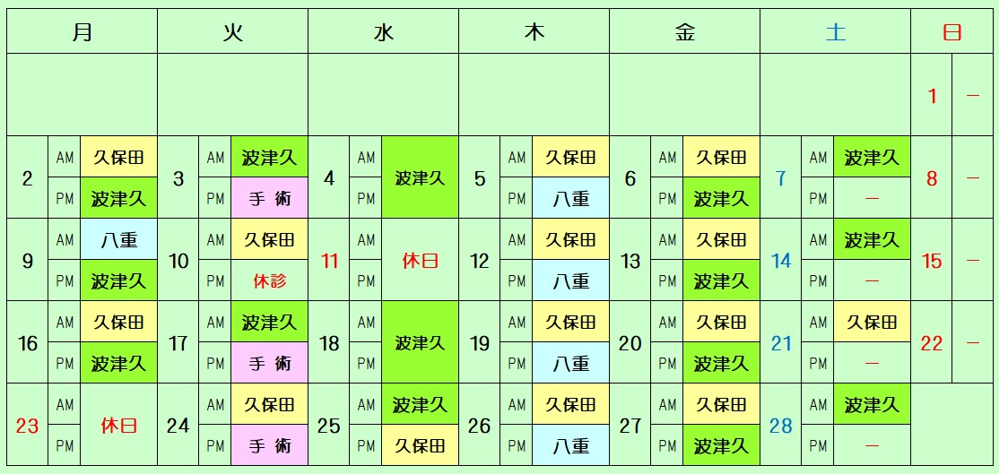 | 診療担当医師・休診日のお知らせ(2025.11.6更新) 学会等の都合により、担当医師が急に変更になることもあります。 12月の予定 ![]() 学会等の都合により、担当医師が急に変更になることもあります。 1月の予定 ![]() 学会等の都合により、担当医師が急に変更になることもあります 2月の予定 ![]() |